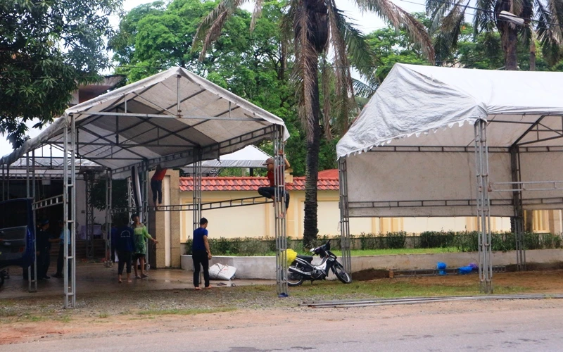 Do tiết trời có mưa nên lực lượng chức năng đang dựng rạp che mưa trước sân và đường dẫn vào Nhà tang lễ Bệnh viện Quân y 4 (Quân khu 4) để chuẩn bị công tác Lễ truy điệu và lễ viếng vào sáng mai (28-7).
