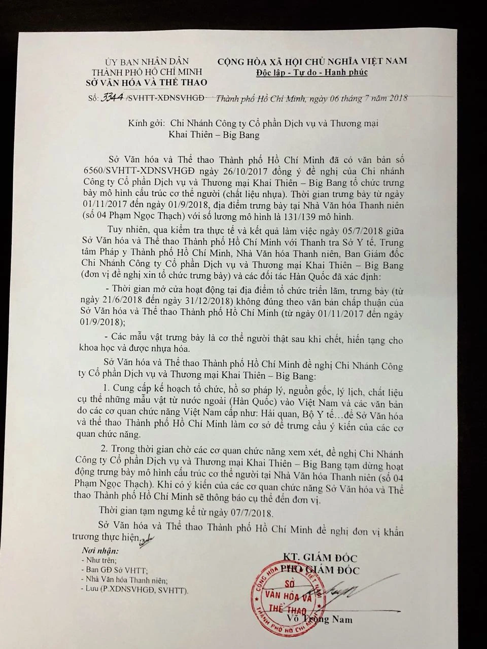 Sở VH-TT TP HCM vừa có văn bản yêu cầu đơn vị tổ chức triển lãm cơ thể người Mystery of Human body dừng hoạt động trưng bày từ ngày 7-7.