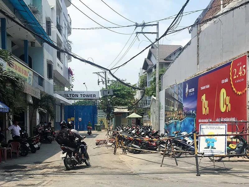 Chủ dự án một chung cư ở quận Bình Thạnh mua nhà dân ở hai bên hẻm ngoài dự án nhằm mở rộng hẻm từ 6 m thành 12 m, kết nối ra đường D1, được coi là một thành công trong việc giải quyết kẹt xe. Ảnh: MP