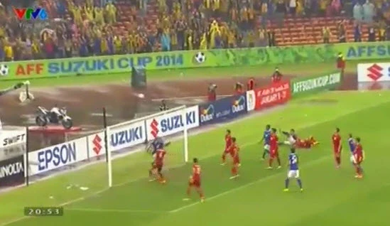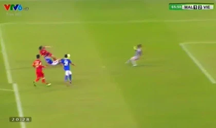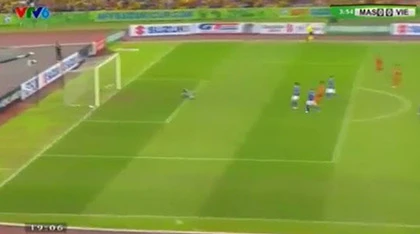 Phút 60, cầu thủ Malaysia có quả treo bóng vào khá nguy hiểm, rất may không cầu thủ Malaysia nào theo kịp.