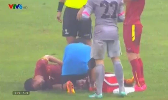 Phút 88, Hoàng Thịnh bị chấn thương sau pha vào bóng quyết liệt của cầu thủ Malaysia.