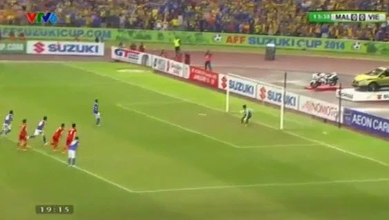 Phút 13, Malaysia được hưởng quả đá phạt 11 mét khi bóng chạm tay Huy Hùng. Huy Hùng phải nhận thẻ vàng trong tình huống này.