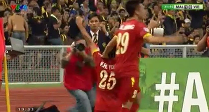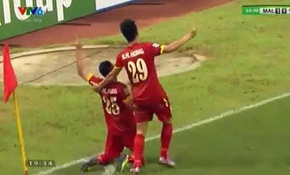 Vàooooooo. Phút 32, tuyển Việt Nam có pha phản công nhanh, Thành Lương có pha chọc khe cho Văn Quyết băng xuống sút bóng rất nhanh, thủ môn Che Mat kịp đổ người đẩy bóng ra nhưng Huy Toàn rất nhanh băng vào sút bồi tung lưới Che Mat san bằng tỉ số 1-1.