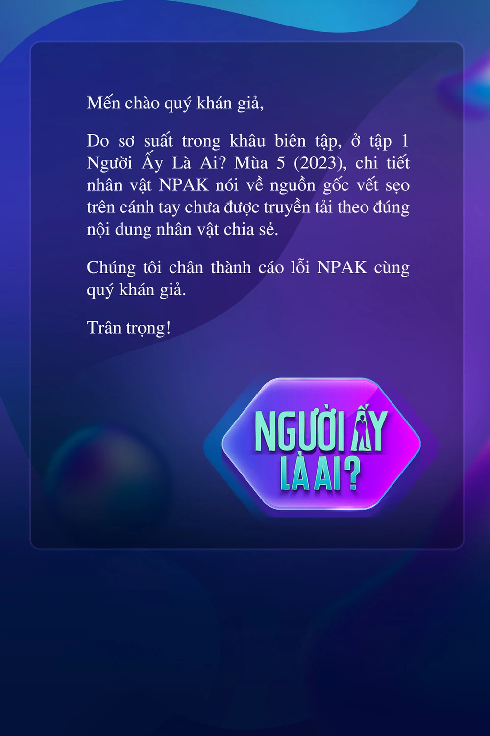 Theo đó, NSX Người ấy là ai? Cho biết: "Do sơ xuất trong khâu biên tập, ở tập 1 Người ấy là ai? Mùa 5 (2023), chi tiết nhân vật NPAK nói về nguồn gốc vết sẹo trên cánh tay chưa được truyền tải theo đúng nội dung nhân vật chia sẻ. Chúng tôi chân thành cáo lỗi NPAK cùng quý khán giả".