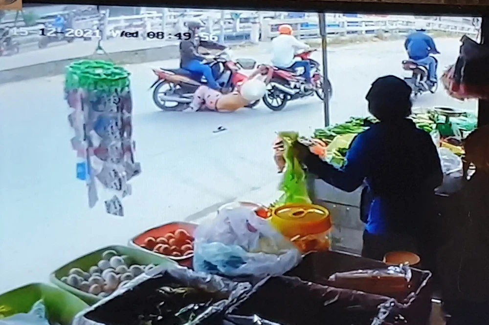 Nữ nạn nhân bị kẻ trộm xe kéo lê hàng chục mét trên mặt đường. Ảnh chụp từ clip