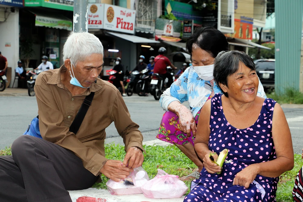Những người bán vé số dạo vui mừng khi được nhận cơm từ thiện. Ảnh: CHÂU ANH