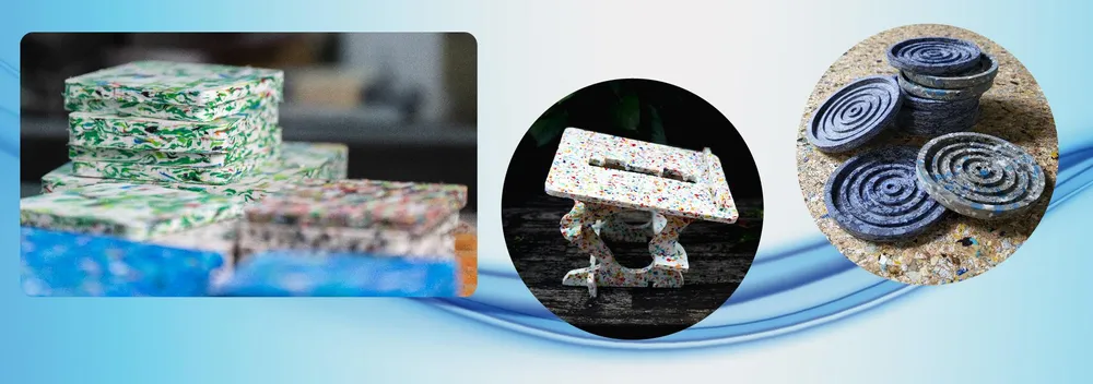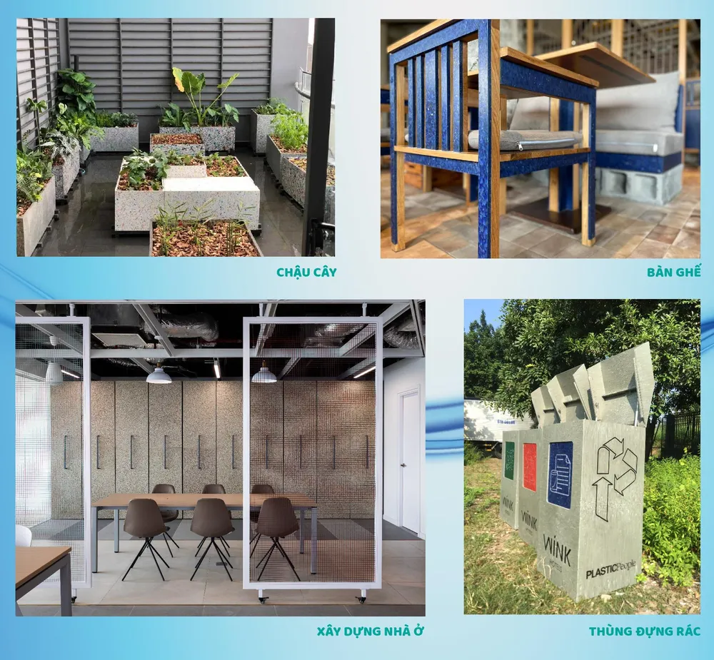 Thế nhưng, PLASTICPeople không dừng lại ở việc tạo ra những tấm ván nhỏ để “ngắm cho vui” mà còn làm ra những thứ hữu dụng trong đời sống như một chiếc lót cốc, một hộp đựng đồ thìa, nĩa, chậu hoa; mặt bàn ghế; xây dựng nhà ở, thiết kế các tiểu công trình… và thậm chí là thùng đựng rác cũng được làm từ rác.