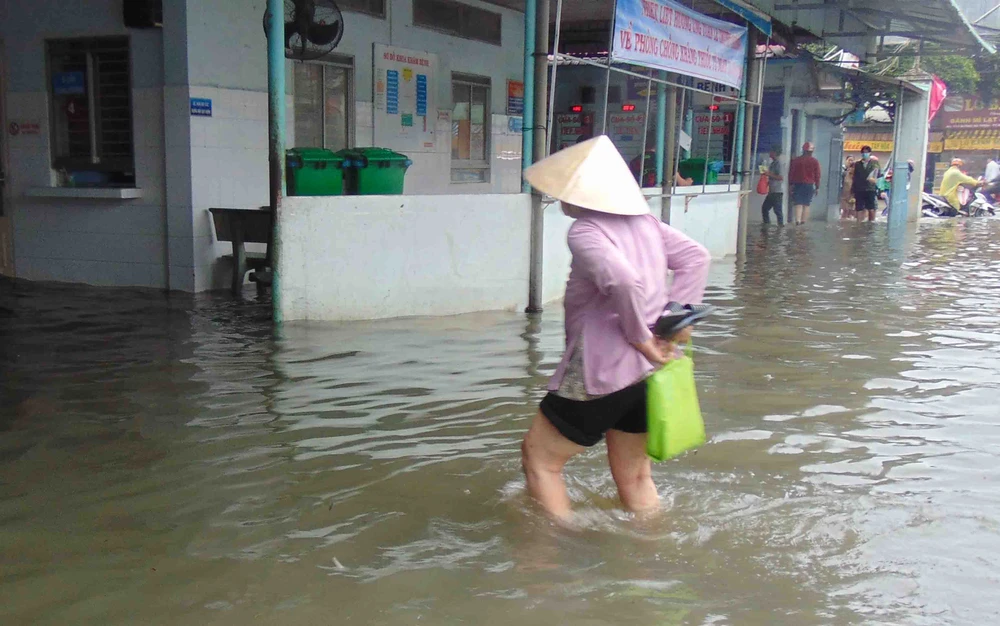 Trước phòng khám bệnh, một nữ bệnh nhân hơn 50 tuổi quần xắn quá gối, tay cầm đôi dép dò dẫm từng bước đi vào trong. Bà than thở: “Lớn tuổi rồi, bệnh hoài nên phải tới BV. Ngặt nỗi cơn mưa quá lớn, ngập gần tới đầu gối khiến tôi vừa đi vừa run”.