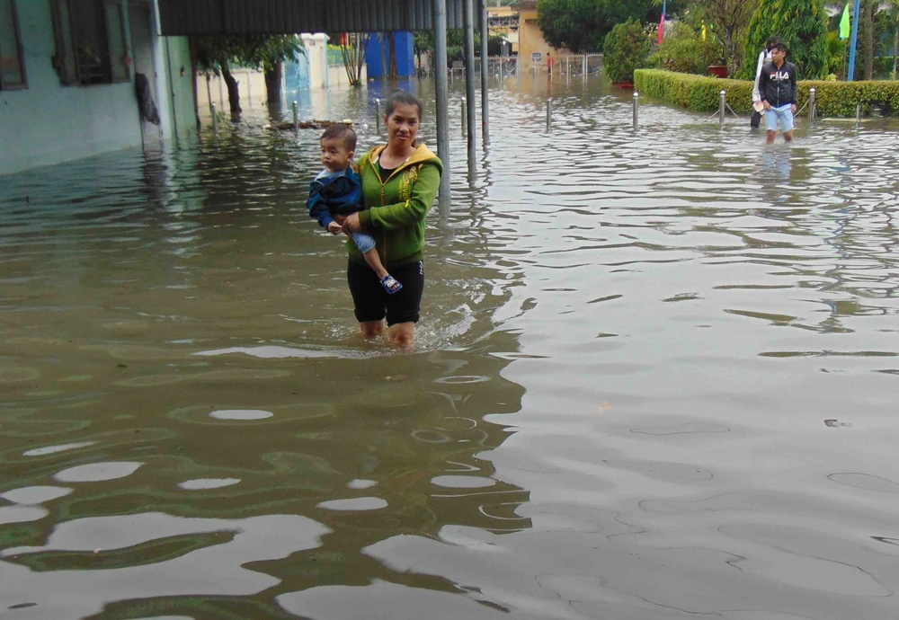 Một phụ nữ bồng con trong khuôn viên BV. Chị bảo: “Tôi có té cũng không sao, chỉ sợ con bị ướt rồi mang thêm bệnh. Mong nước mau rút để mọi người đi lại dễ dàng hơn”.