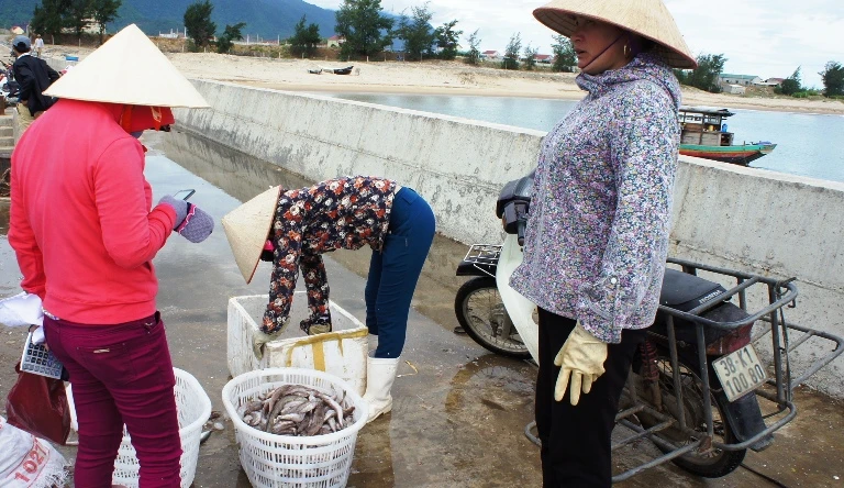 Tiểu thương thu mua hải sản đánh bắt xa bờ cho ngư dân ở thị xã Kỳ Anh (Hà Tĩnh). Ảnh: Đắc Lam