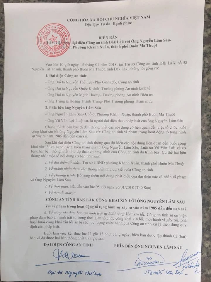 Ngày 15-1 tại Công an tỉnh Đắk Lắk, cơ quan này đã làm việc với ông Nguyễn Lâm Sáu (78 tuổi, ngụ phường Khánh Xuân, TP Buôn Ma Thuột, Đắk Lắk) về việc sẽ tổ chức buổi xin lỗi công khai vì đã làm oan ông từ 33 năm trước.