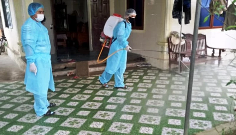 Lực lượng y tế phun thuốc khử trùng tại gia đình người dân ở xã Nghi Xá (huyện Nghi Lộc, Nghệ An).