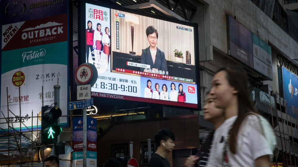 Thông báo rút bỏ hoàn toàn dự luật dẫn độ tội phạm về Trung Quốc đại lục của Trưởng Đặc khu Carrie Lam phát sóng công khai ở Hong Kong ngày 4-9. Ảnh: AP