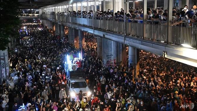 Những người biểu tình đã hô hào hàng trăm khẩu hiệu phản đối hoàng gia Thái Lan. Những cảnh tượng này gần như không thể tin được sẽ xảy ra tại đất nước mà nhà vua cũng như hoàng gia được bảo vệ bằng các đạo luật chống phỉ báng hoàng gia hà khắc nhất thế giới.