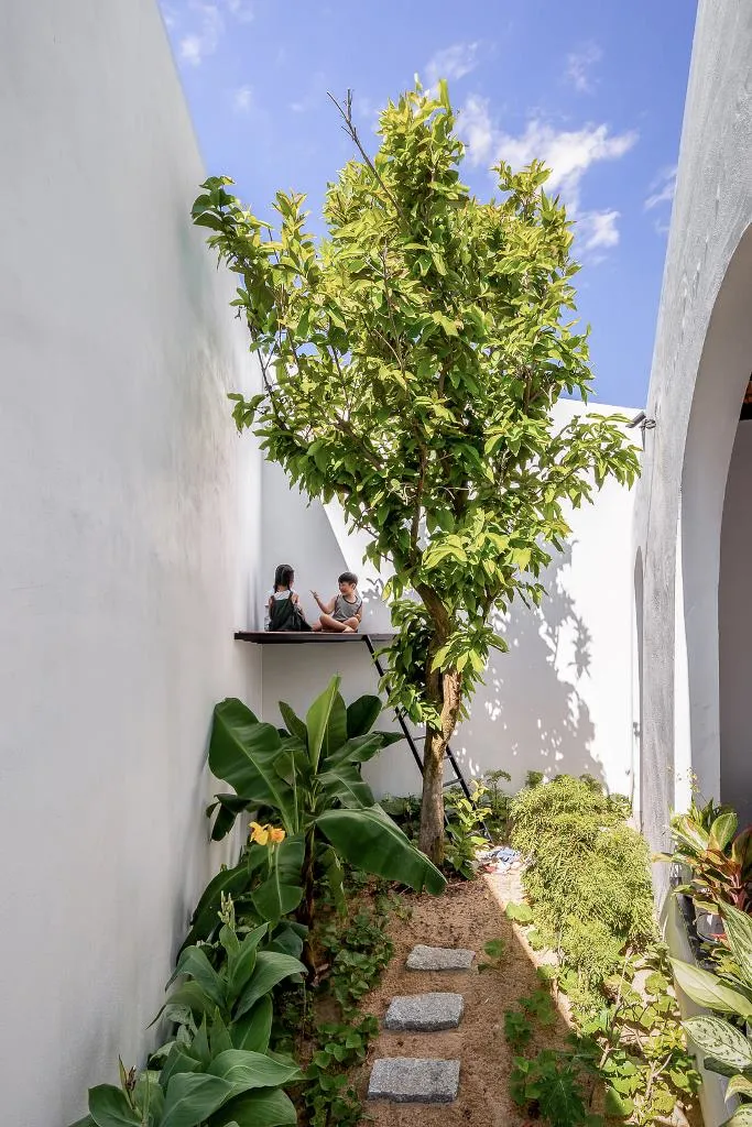 Việc tách rời không gian các phòng tạo ra nhiều khoảng sân trong tràn ngập cây xanh và ánh sáng. Khoảng sân trong này cũng là khu vui chơi các trò chơi dân gian của con và bạn bè hàng xóm.
