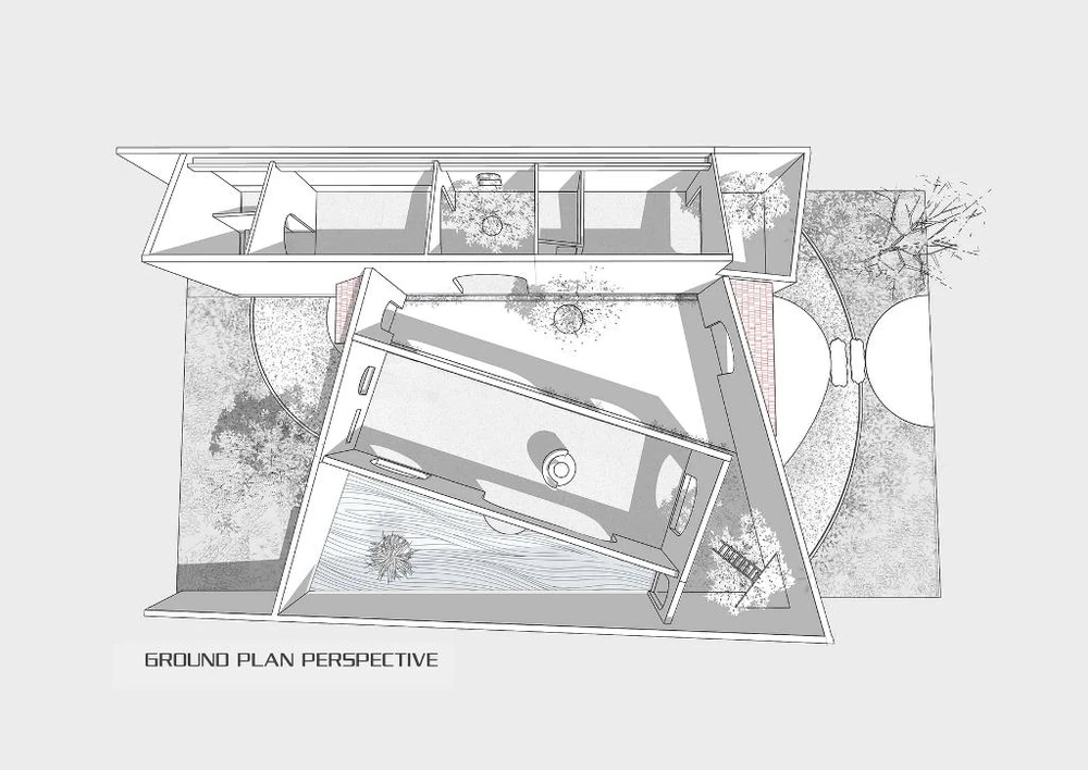 Khối không gian phòng khách và phòng bếp được xoay lệch so với khối phòng ngủ và các mảng tường rào vách xéo tạo ra các góc nhìn thú vị và sinh động khi chúng ta di chuyển bên trong ngôi nhà.
