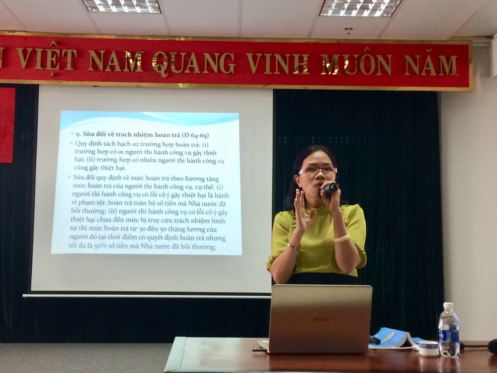 Tại hội nghị, bà Liên trình bày một số điểm quan trọng của Luật Trách nhiệm bồi thường nhà nước năm 2017 về đối tượng được bồi thường, nguyên tắc bồi thường, cách xác định thiệt hại khi bồi thường, thủ tục bồi thường…