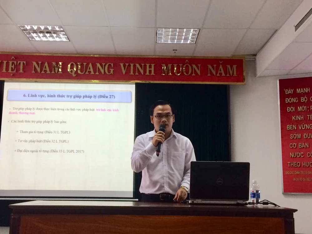 Tại hội nghị ông Trần Minh Huệ (trợ giúp viên Trung tâm Trợ giúp pháp lý TP.HCM) giới thiệu Luật Trợ giúp pháp lý 2017 và các văn bản hướng dẫn thi hành.