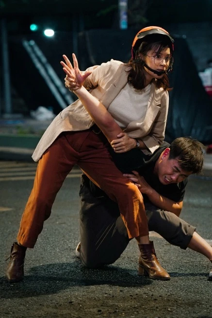 Khoác lên mình bộ trang phục màu jean bụi bặm, nhà báo Loan đang thẳng tay khống chế nhân vật Cường (Huyme) trước ánh mắt ngỡ ngàng, pha chút sợ hãi nơi thanh niên Bình.