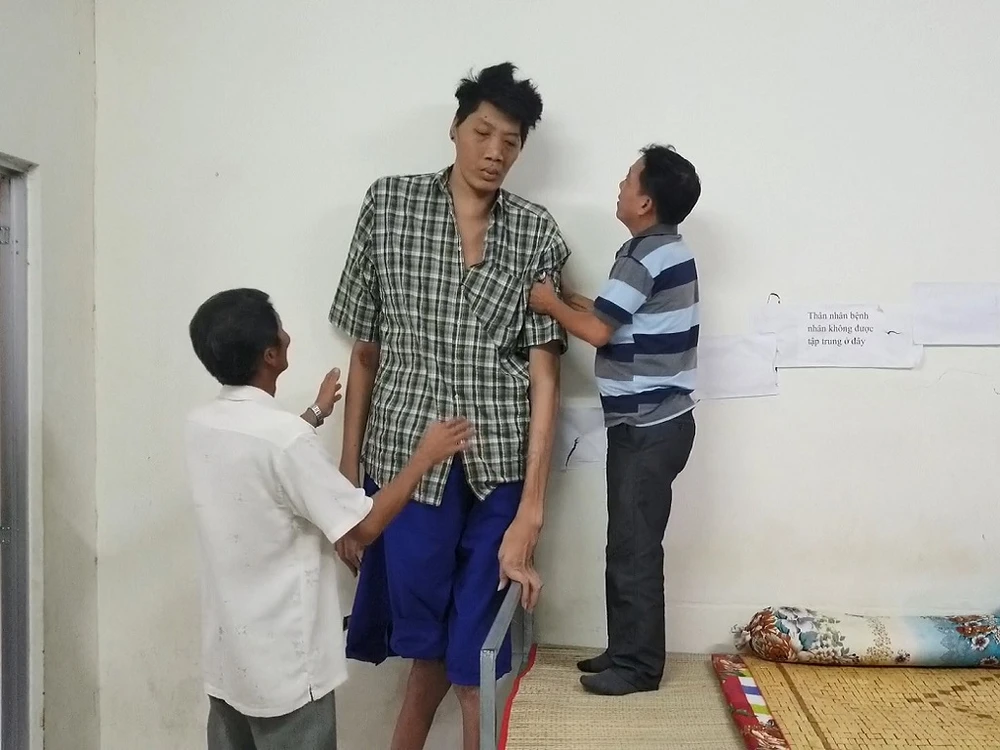 Ngày 15-12, tại BV đa khoa tỉnh Cà Mau, anh Hồ Văn Trung đã gượng đứng lên được để phóng viên đo chiều cao khi anh đứng.