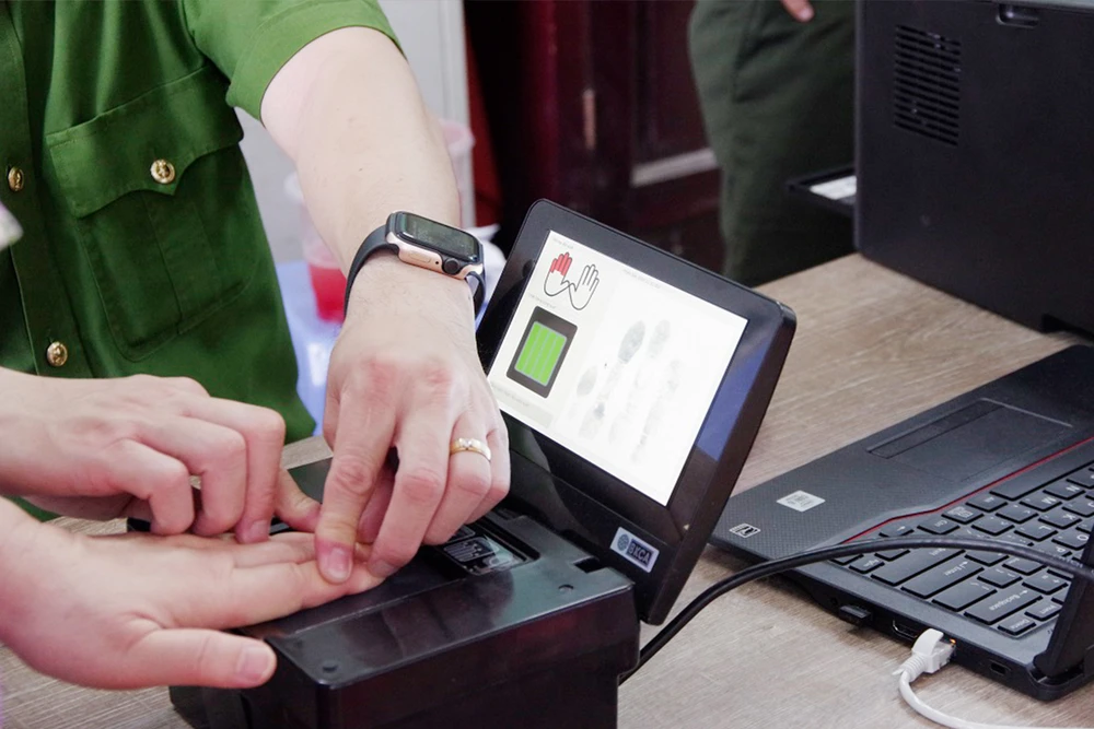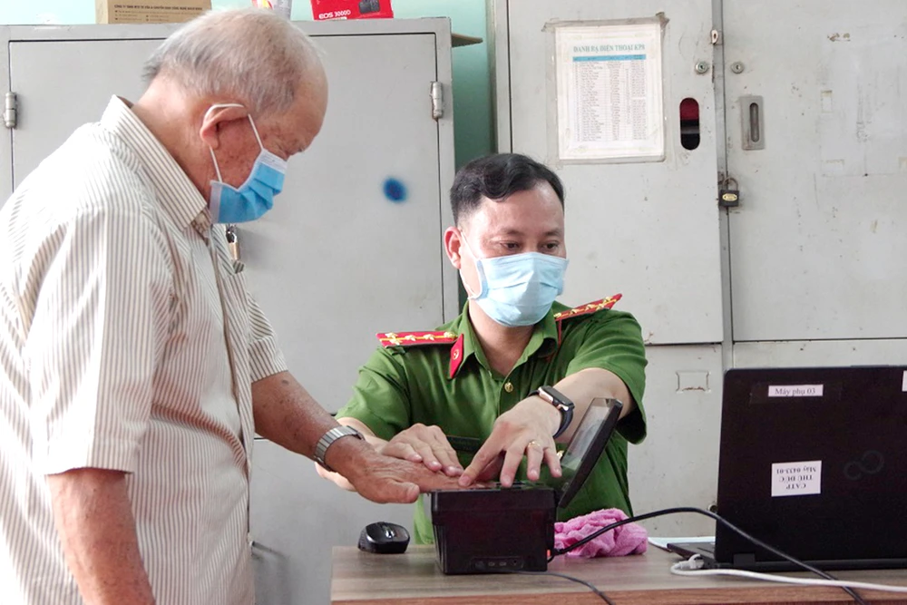 Công an TP Thủ Đức, TP.HCM đang lấy dấu vân tay để làm thủ tục cấp CCCD cho một người cao tuổi. Ảnh: THANH TUYỀN