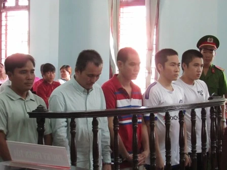 Từ trái qua, các bị cáo Nhỏ, Kiều, Vô, Tuấn và Hùng nghe tòa tuyên án ngày 15-12. Ảnh: N.NAM