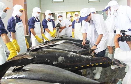 Các chuyên gia thủy sản Nhật kiểm tra chất lượng cá ngừ của ngư dân Bình Định trước khi vận chuyển bằng máy bay sang Nhật bán đấu giá. Ảnh: TẤN LỘC
