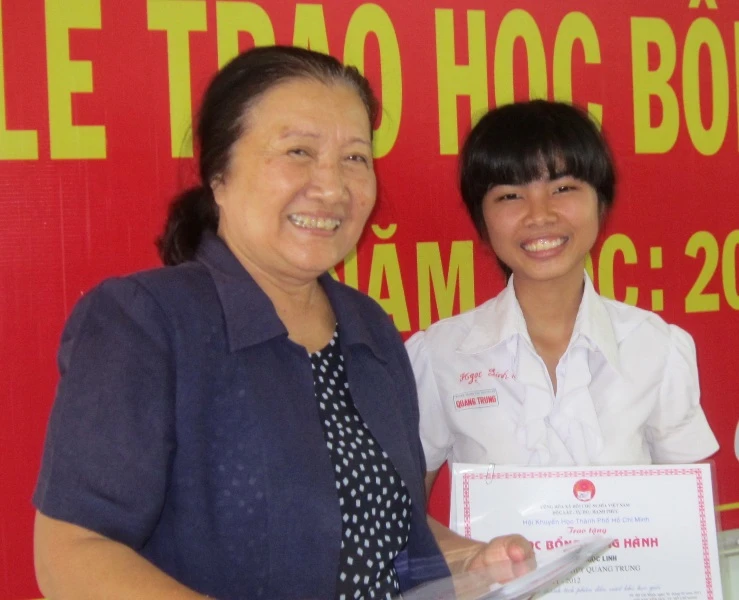 Biết đến bà trước đó cùng việc tìm hiểu thông tin qua mạng, cô Quế Lan (cựu tù Côn Đảo) đã chủ động tìm đến bà, xin được giúp sức mình vào công tác khuyến học. Cô đã xin bà trợ cấp phần học bổng trị giá 10 triệu đồng cho Hoa (Củ Chi), chia ra từng tháng, mỗi tháng một triệu. Cô Lan bảo: “Mỗi tháng tôi được chu cấp 800 nghìn tiền cựu tù, bỏ thêm vào đó 200 nghìn nữa thì sẽ giúp được các em ấy học hành tốt hơn”.