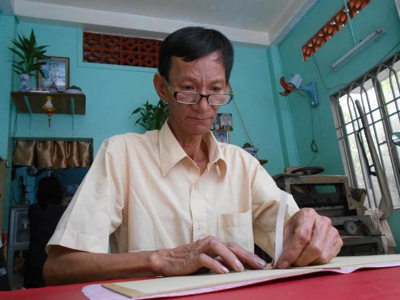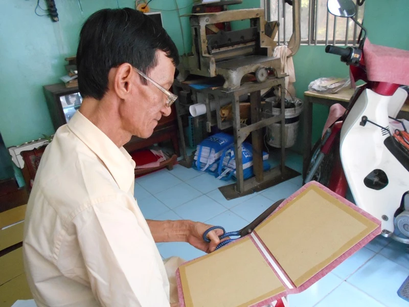 Dụng cụ hành nghề của ông có phần “cổ lỗ sĩ”, chỉ vỏn vẹn cái dao rọc giấy, mảnh bìa cứng, kéo, hồ, kim chỉ cùng với một cái máy cắt giấy đã cao tuổi