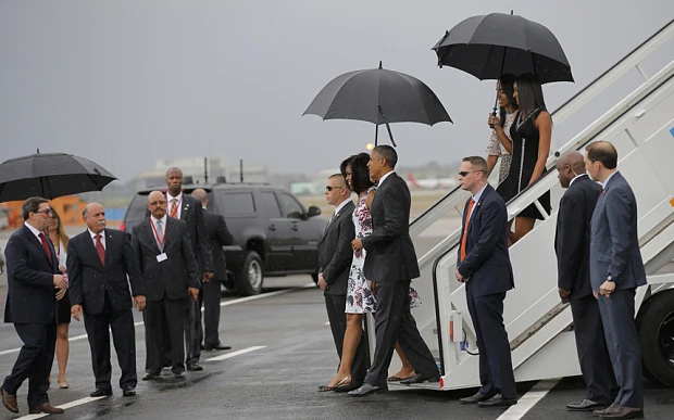 Theo Telegraph, Tổng thống Obama đã mỉm cười xuất hiện cùng với đệ nhất phu nhân Michelle và hai cô con gái là Sasha và Malia từ chiếc máy bay Không Lực Một trong khi tay nắm chặt chiếc dù để che mưa cho vợ ông tại sân bay Hanava.