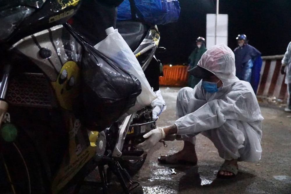 Nhóm thiện nguyện SOS Đà Nẵng tiếp tục theo đoàn người qua đến trạm dừng chân ở thị trấn Lăng Cô (thuộc địa phận tỉnh Thừa Thiên Huế, giáp ranh Đà Nẵng) để sửa xe cho người dân nhằm đảm bảo an toàn nhất trên hành trình tiếp theo. Ảnh: BÙI TOÀN