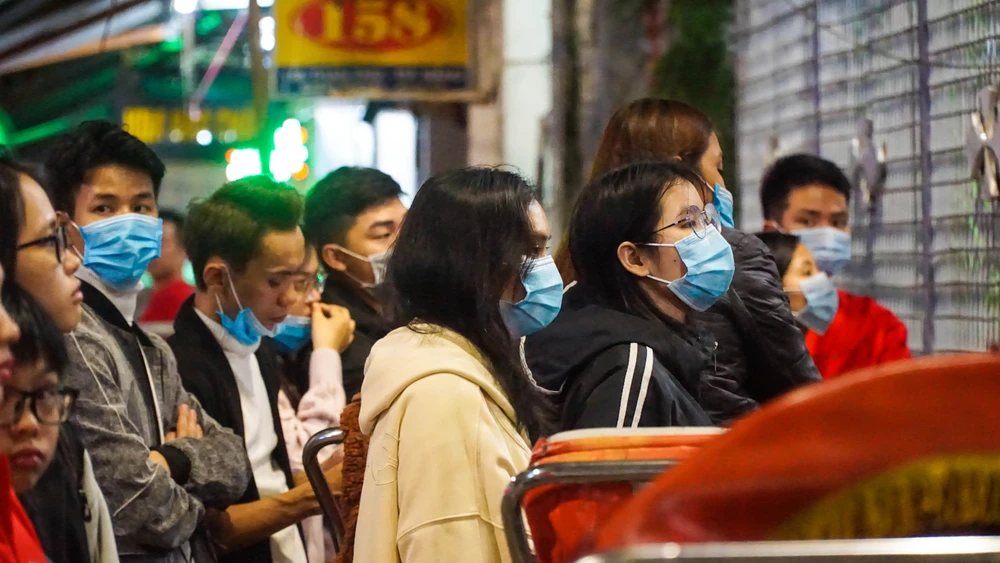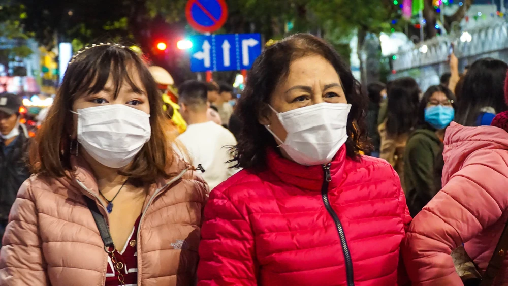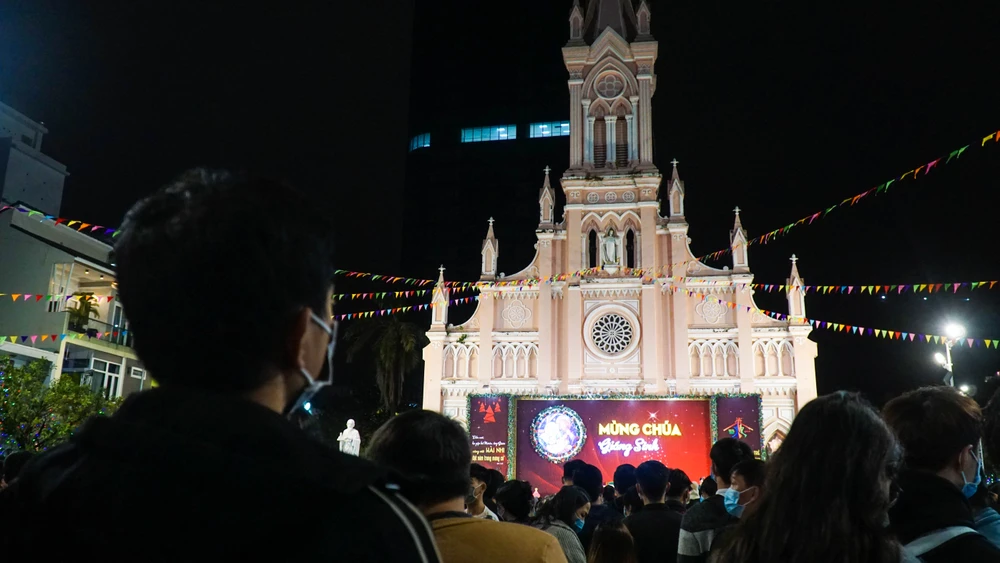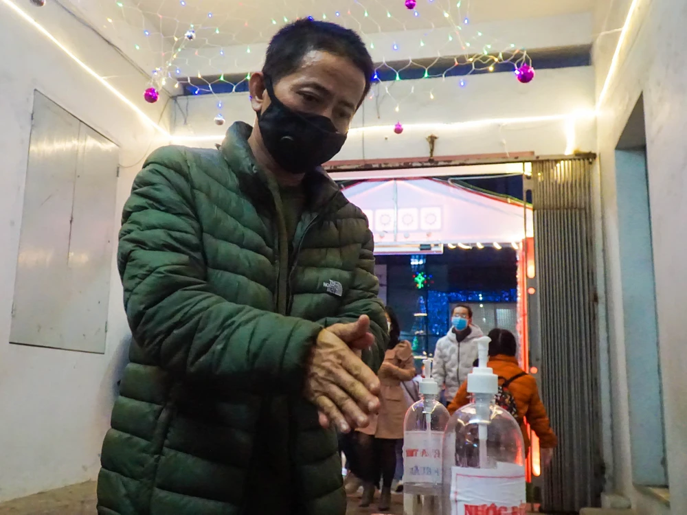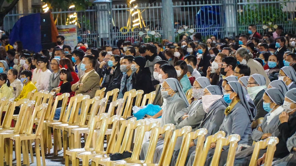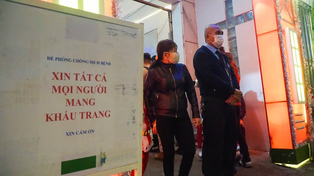 Hàng trăm giáo dân tập trung tại nhà thờ Con Gà để chờ đón thời khắc Giáng sinh. Hầu hết tất cả mọi người đều tuân thủ việc đeo khẩu trang.