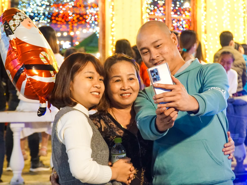 Các gia đình và nhiều bạn trẻ chụp ảnh lưu niệm tại chợ đêm Helio