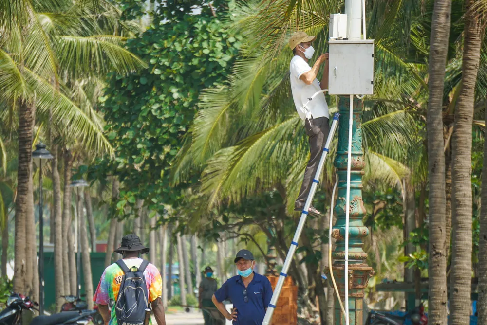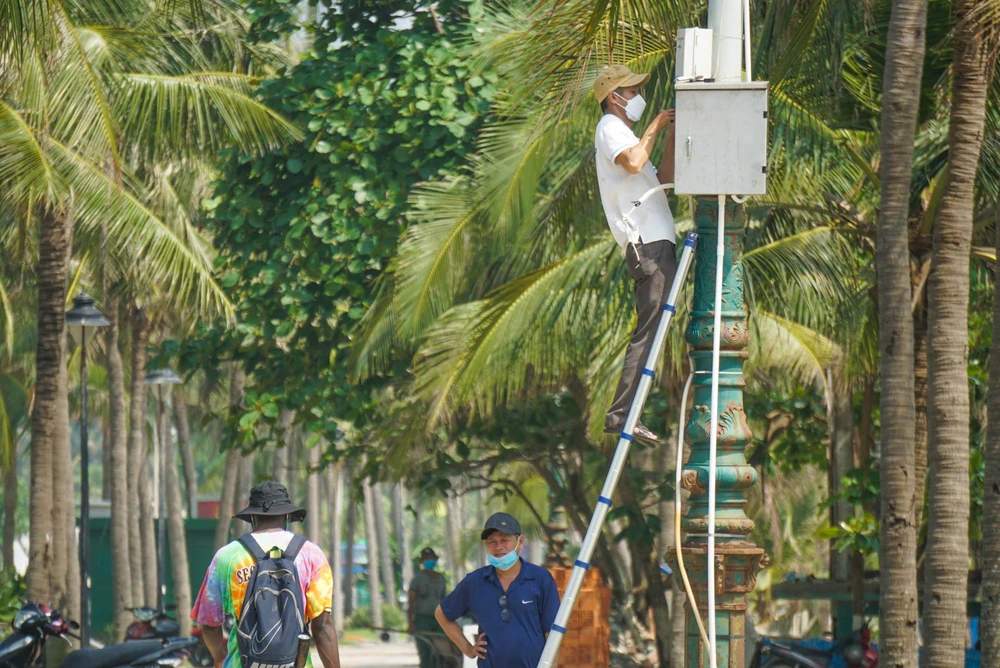Công nhân kiểm tra hệ thống chiếu sáng, loa tại bãi biển Mỹ An. Ảnh: BT.