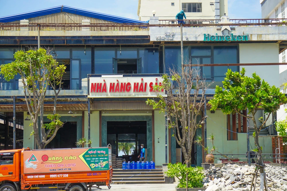 Hàng quán ven biển Đà Nẵng tất bật sửa chữa, dọn dẹp. Ảnh: BT.