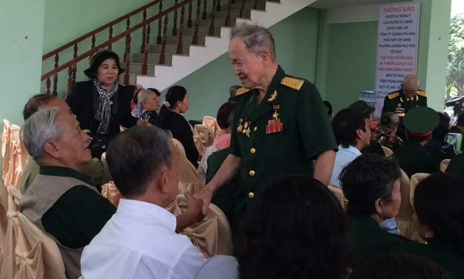 Đại tá Nguyễn Văn Tàu (Tư Cang) Chính ủy Lữ đoàn 316 cùng các cựu chiến binh tại buổi họp mặt truyền thống ngày 24-4-2016. Ảnh: Hoàng Tuyết