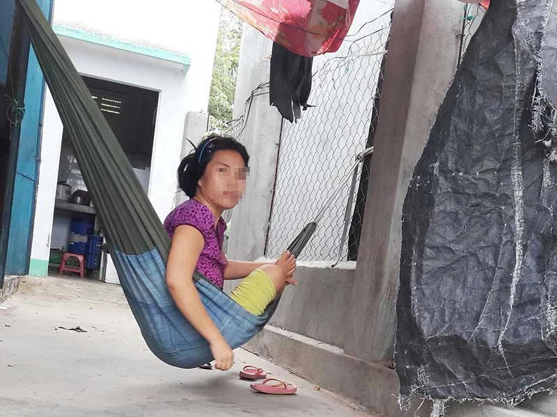 Khuyên nhủ mãi, chị Ngọc Hâng mới qua nhà mẹ ngồi chơi trên võng một lát. Ảnh: THANH SƠN