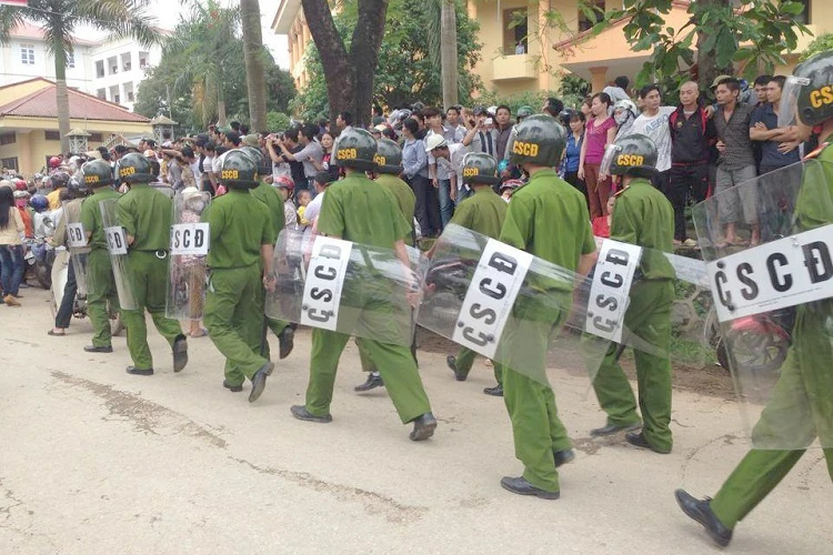 Lực lượng công an tỉnh phải xuống để giữ gìn trật tự. Ảnh CTV Theo Đại tá Hà Minh, Phó giám đốc Công an Tỉnh Phú Thọ, vụ việc phát sinh từ việc chiều 5-5, khi cơ quan chức năng huyện Tam Nông mở cuộc họp trả lời những bức xúc của người dân về việc Công ty Sông Vàng khai thác cát trên sông Bứa. Người dân tố cáo công ty này đã đào trộm khắp nơi, gây sạt lở đất. Ngoài ra, họ cho rằng công ty này đã "bẫy" một người dân tên Nguyễn Công Thức vào tội "cưỡng đoạt tài sản" để công an bắt, hòng có thể khai thác cát trên phần đất của anh này. Tuy nhiên, cuộc họp phải tạm dừng vì người dân kéo đến quá đông, gây mất trật tự. Chưa thỏa mãn với phần trả lời của cơ quan chức năng, người dân đã có những hành động quá khích như trên.