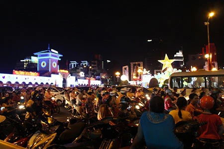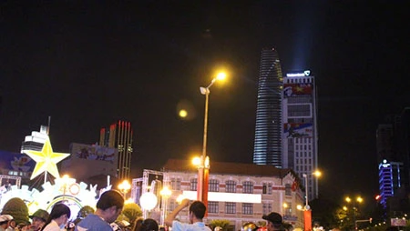 20 giờ 30 phút, dòng người đông nghẹt đổ dồn về trung tâm thành phố để theo dõi bắn pháo bông.