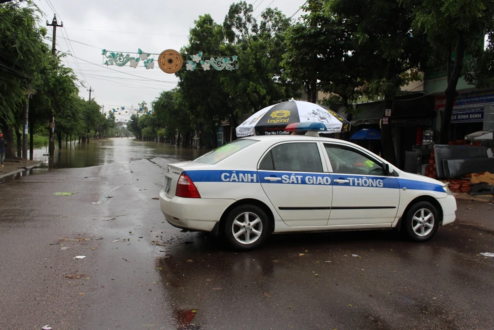Tuyến đường Hùng Vương từ TP Quy Nhơn đi về các huyện và ngược lại đi bị ngập sâu, lực lượng chức chốt giữ đầu đường để hướng dẫn người dân đi lại.
