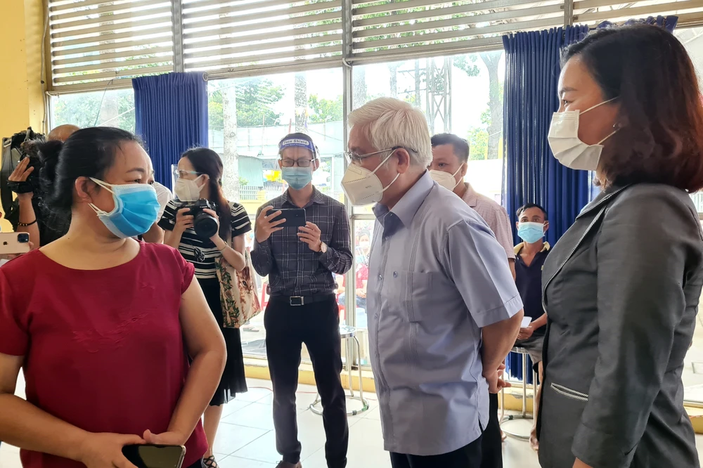 Bà Nguyễn Thị Mai (áo đỏ) được ông Nguyễn Văn Lợi- Bí thư tỉnh ủy Bình Dương thăm hỏi khi vừa được tiêm vaccine. Ảnh: LÊ ÁNH