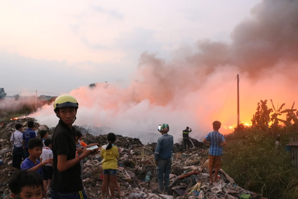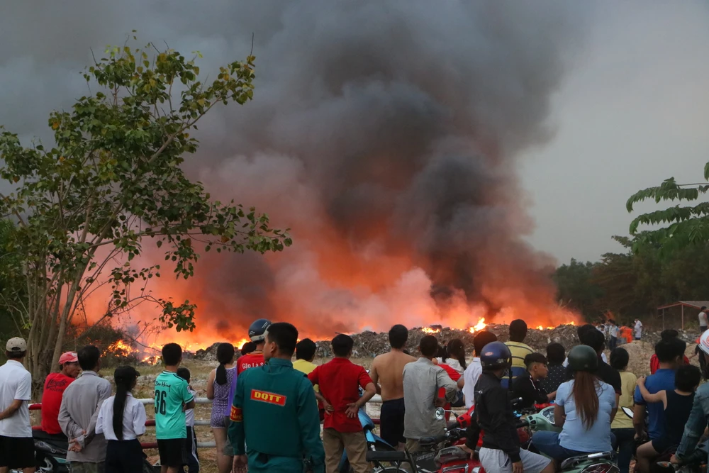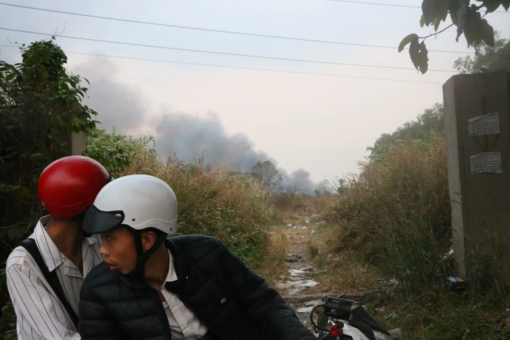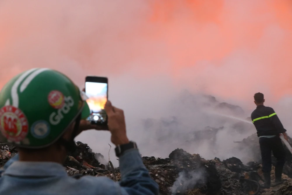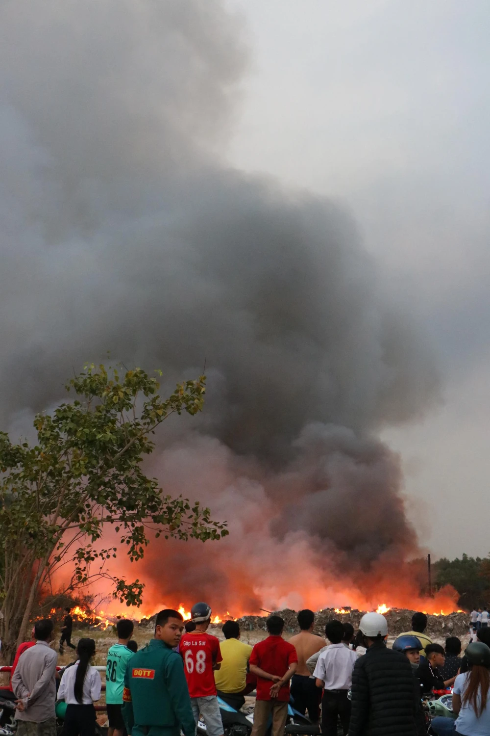 Do bãi rác có nhiều nhựa phế thải nên lửa lan nhanh, khói bao trùm khu dân cư, cột khói bốc cao hàng chục mét. Nhiều người dân hiếu kỳ đổ xô đi xem cháy.