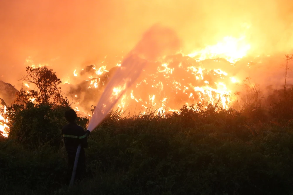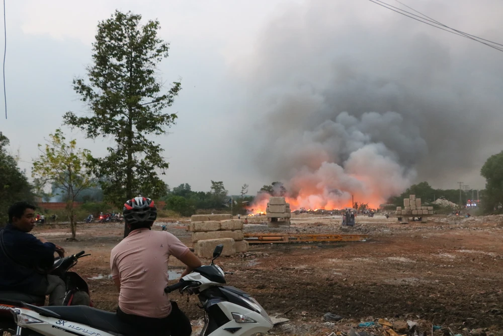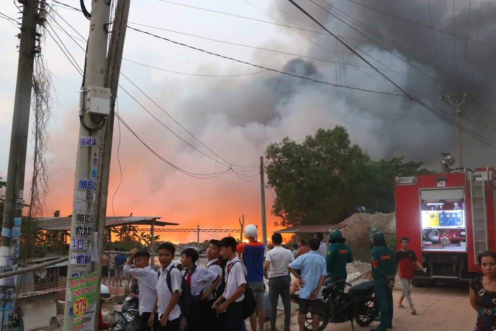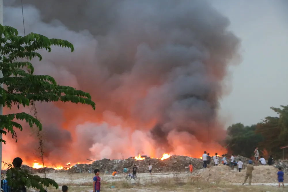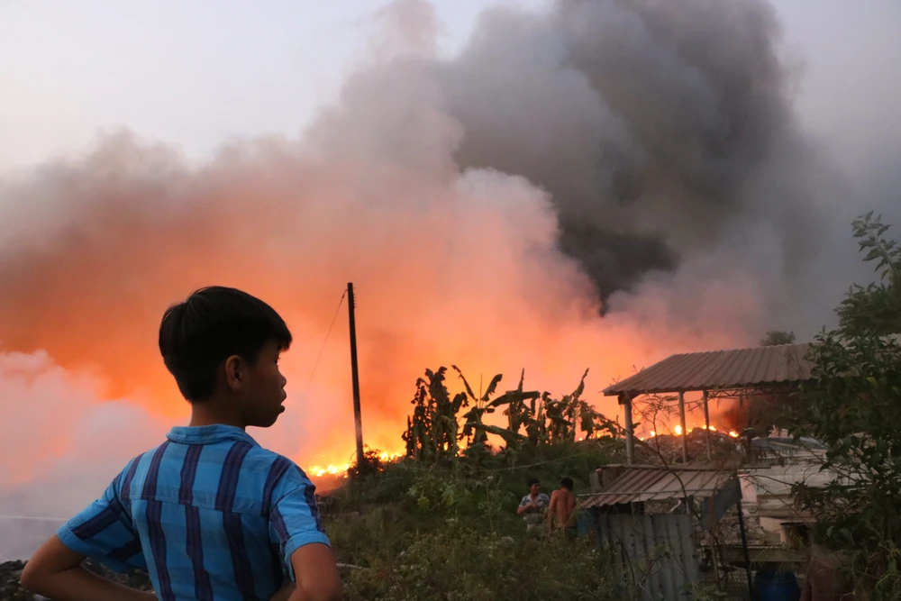 Do bãi rác có nhiều nhựa phế thải nên lửa lan nhanh, khói bao trùm khu dân cư, cột khói bốc cao hàng chục mét. Nhiều người dân hiếu kỳ đổ xô đi xem cháy.