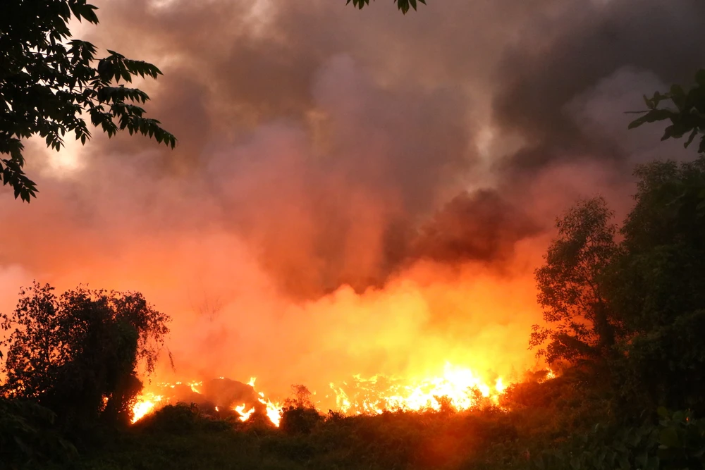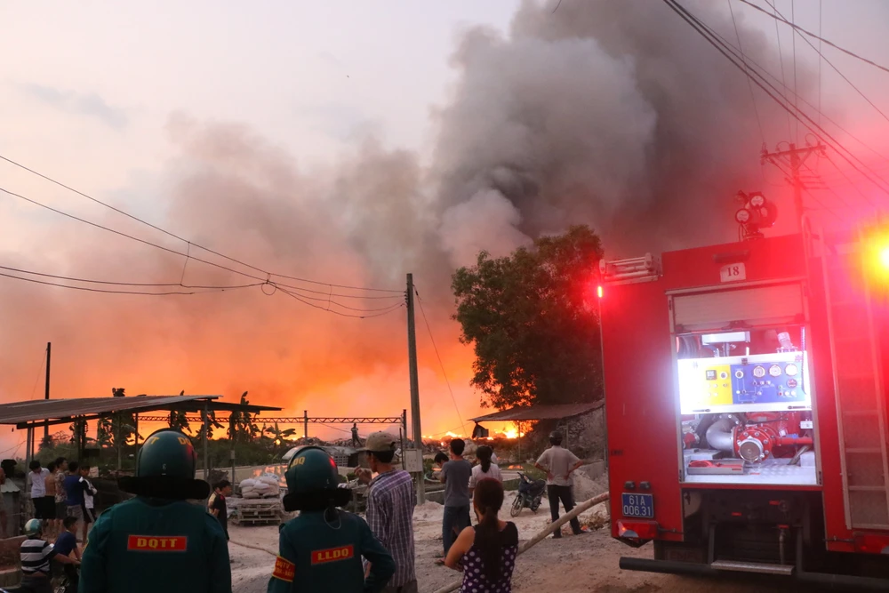 Đám cháy lớn xảy ra tại một bãi rác tự phát, rộng hàng ngàn mét vuông nằm trong khu đất đang chuẩn bị xây dựng công trình công cộng, giữa khu dân cư Hòa Lân 1 (phường Thuận Giao, thị xã Thuận An, Bình Dương).