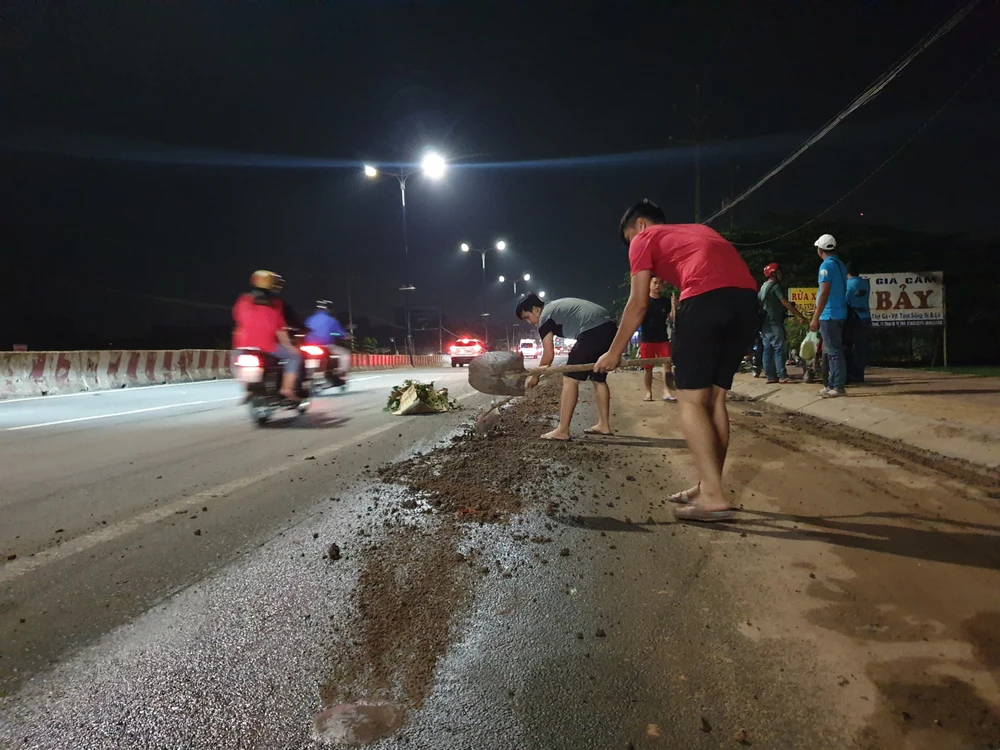 Thấy vậy, người dân gần đó phải xúc đất đổ ra để tạm thời lấp vệt nhớt, tránh gây nguy hiểm cho người đi đường.