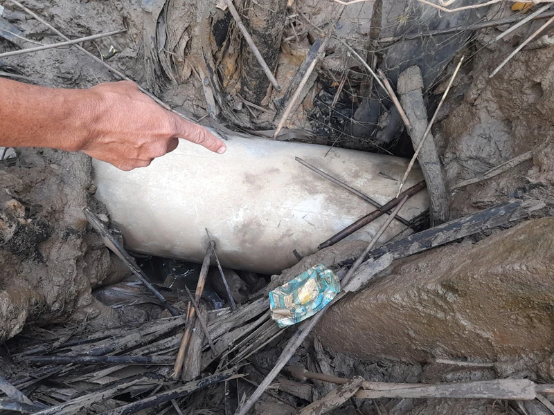 Tại hiện trường, đường ống thoát nước (loại ống 250 mm) dài hơn 150 m của công ty Thuyên Phong Mật được thả dưới một con mương nhỏ đi qua phần đất của một hộ dân, nối vào miệng cống có sẵn rồi xả thải trực tiếp ra kênh.