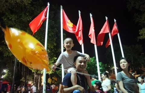 Phụhuynh dẫn các cháu vui chơi tại phố đi bộ tối ngày 2-9 tại thủ đô Hà Nội. Ảnh: PHI HÙNG