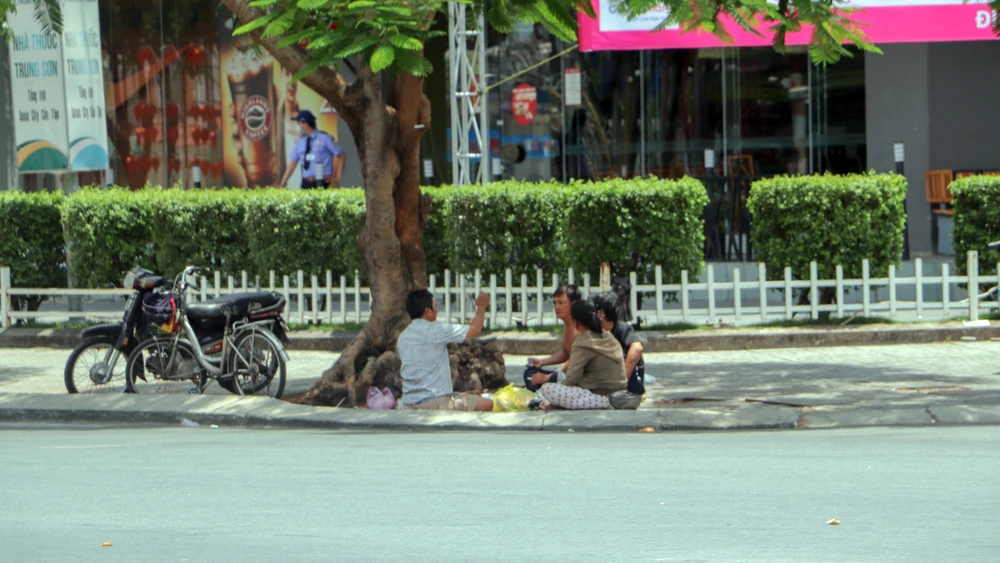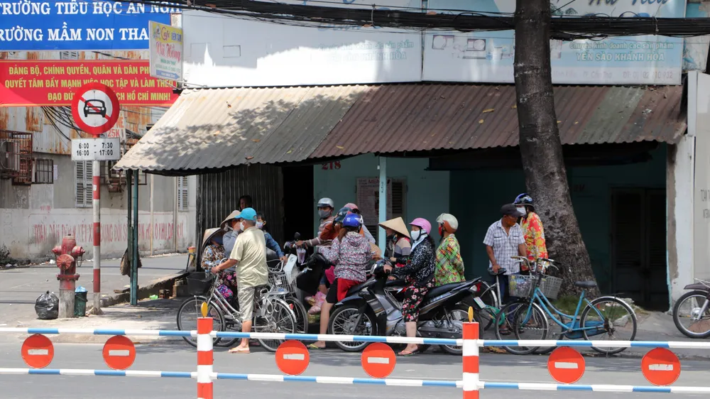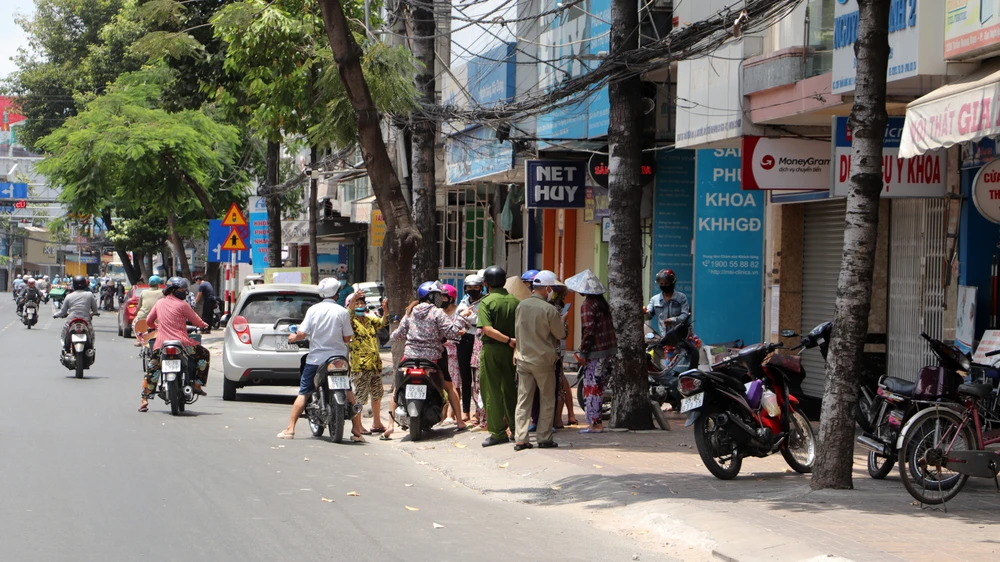 Nhóm người này tập trung chờ một cơ sở kinh doanh trên đường Trần Hưng Đạo phát quà hỗ trợ.