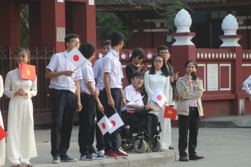 Một em học sinh được bạn đẩy xe lăn ra đường để cùng đón Nhà vua và Hoàng hậu Nhật Bản. Ảnh: NGUYỄN DO