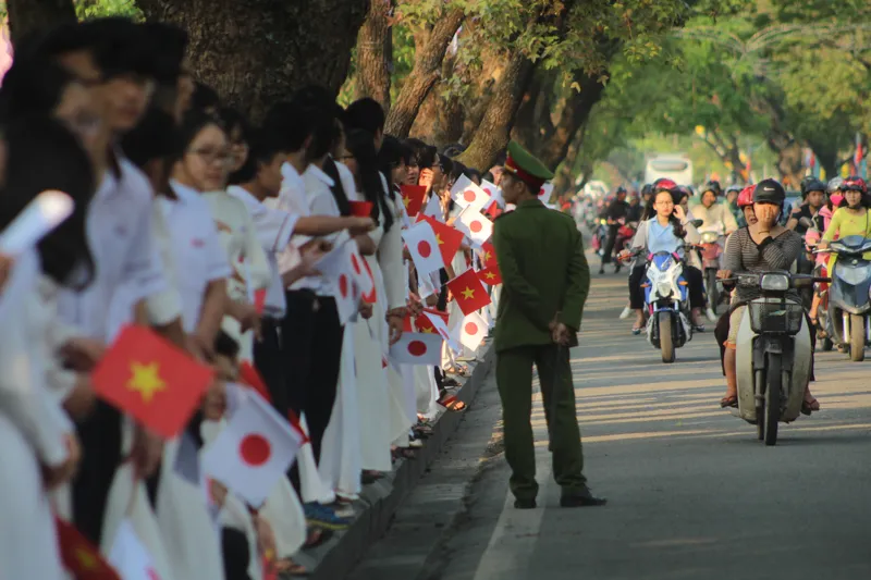 Trên tuyến đường Lê Lợi có rất nhiều người dân cùng với học sinh đã đợi sẵn để được chào đón Nhật hoàng và Hoàng hậu bắt đầu chuyến thăm Cố đô Huế. Rất đông học sinh hào hứng đứng đợi trên trục đường Lê Lợi. Ảnh: NGUYỄN DO